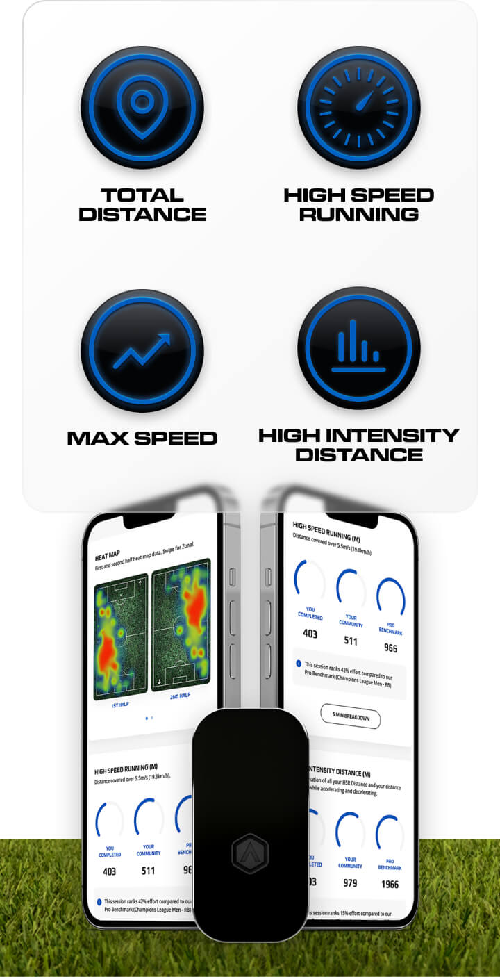 Wear the tracker in the specially designed vest, sync it with the app, and start training. Instantly view and analyze your data to fine-tune your performance – whether you're on the pitch, field, or track.
