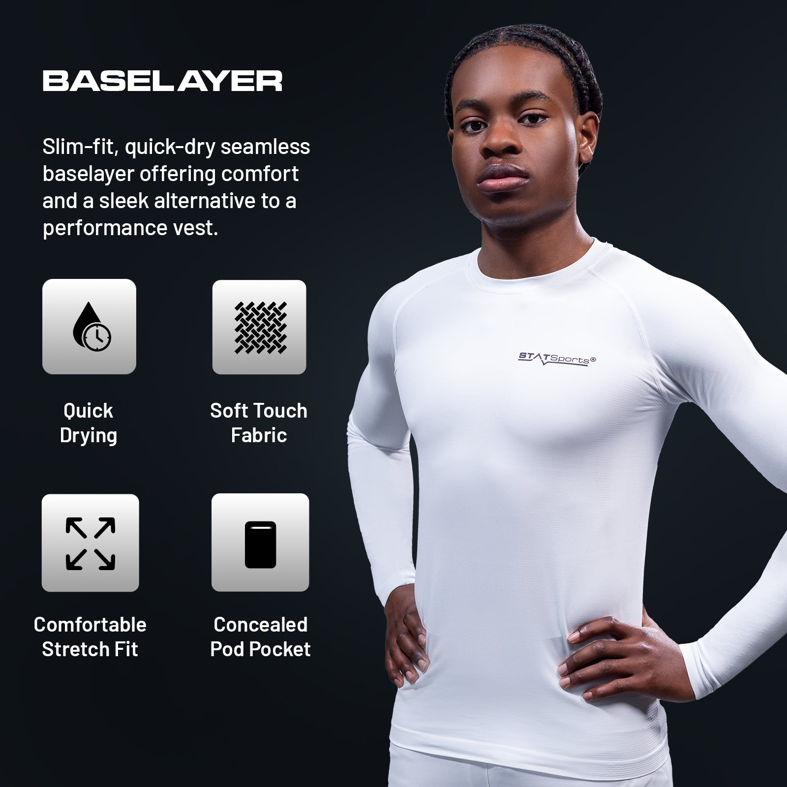Each baselayer features a concealed pod pocket to securely hold your STATSports Pod, making it perfect for seamless performance tracking. Crafted from breathable fabric, it keeps athletes warm, dry, and focused — an ideal alternative to the vest on cooler evenings.